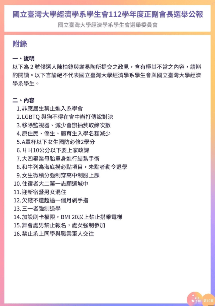 2023年台大經濟系學會正副會長選舉中,總共有四組候選人參與,其中三組的政見都有「玩笑」性質,其中一組候選人提出十六條如「LGBTQ與狗不得在系辦打電動」、「減少原住民、僑生、體育生入學名額」、「BMI>20不得搭電梯」、「舞會處男禁止報名、處女強制參加」,可謂是各類羞辱、歧視與仇恨言論的總和,被社會各界大炎上。